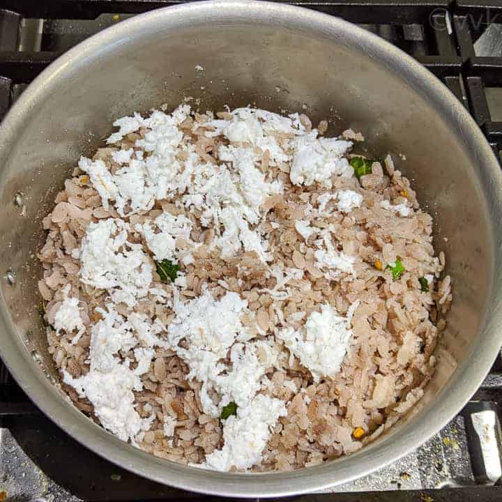 - Immediately add the coconut and gently mix. And turn off the heat.