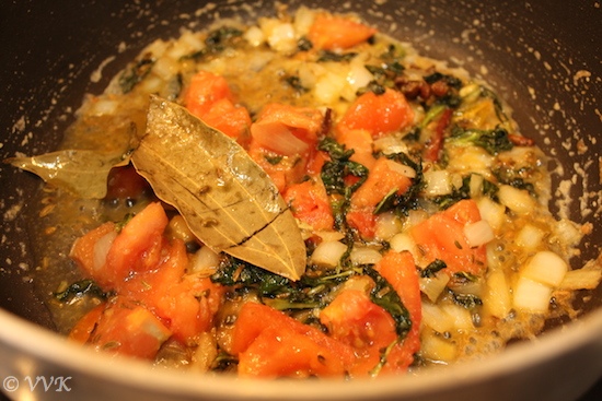 - After 30 seconds, add bay leaf, aniseed, cloves, cardamom, green chilies, and sauté well for two minutes. Do not overcook the fennel seeds, as it turns bitter.