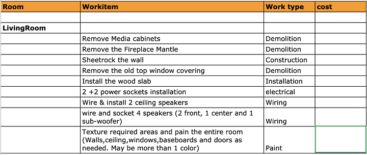 The first and foremost step in any project is to understand the scope of the project. This is an iterative process. We start from the high-level work items like the rooms that will be part of the renovation and then detail further to the individual tasks.