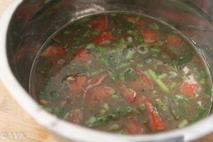 - In a heavy-bottomed vessel (like an eeya sombu or any sturdy pot), combine the ground paste with chopped tomatoes, salt, cilantro, and 1 cup of water (rinse the mixer jar to use up the residue).