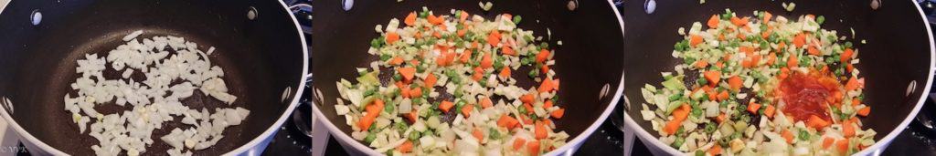 - Once the onion turns translucent, add the other chopped veggies (beans, carrots, cabbage and green onions) and salt.