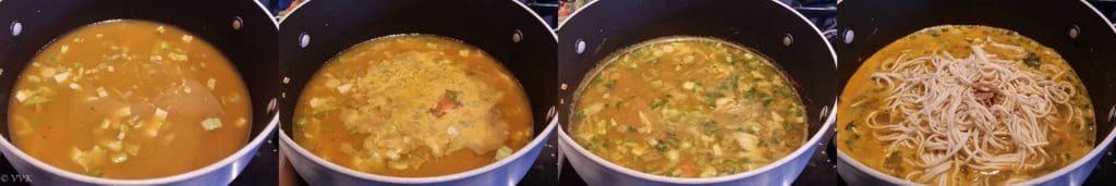 - If the soup thickens, (noodles will absorb all the water content) add more water, salt, and pepper powder and simmer it again before serving.