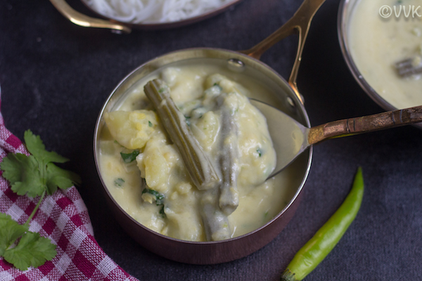 Sodhi is a vegan stew where we cook the potatoes and moringa pods or drumsticks in coconut milk, and we thickened with split yellow mung beans. The additional flavor comes from green chili, shallots, ginger, and garlic. We don’t need any separate spices, and also we don’t need to do any tempering.