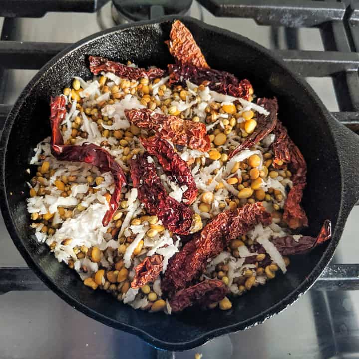 - Heat a small pan and dry roast the coriander seeds, dried red chilies, chana dal, and fenugreek seeds until the aroma comes.