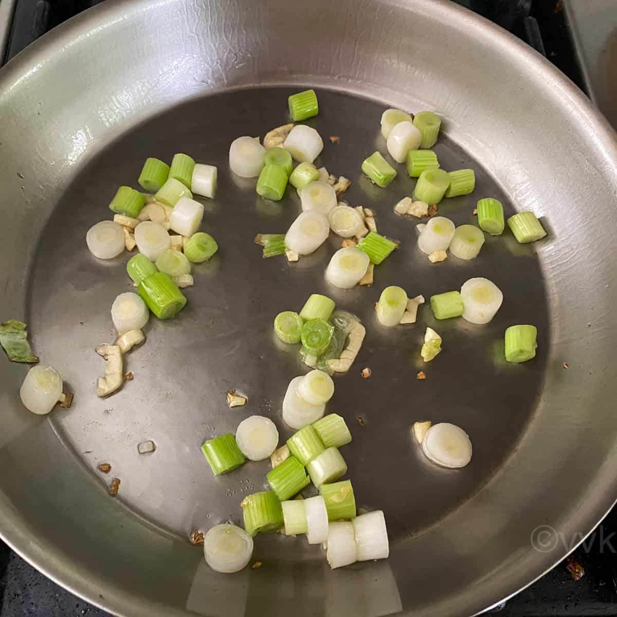 - Heat a pan or wok and add the oil. When the oil is hot, add the white part of the green onions and garlic and saute for a couple of minutes.