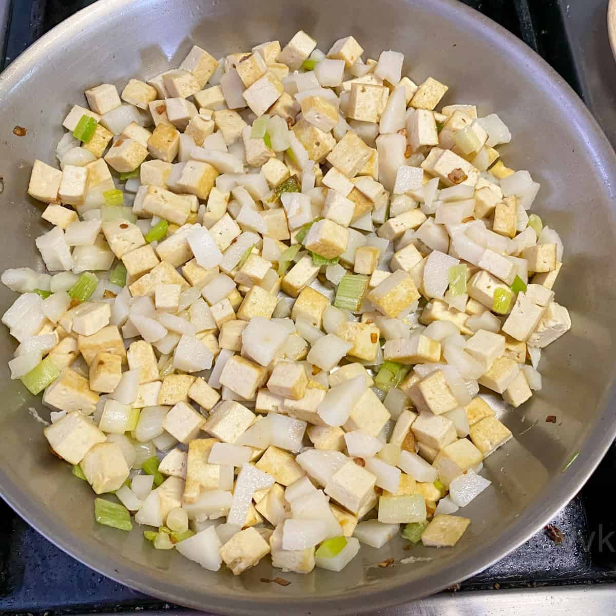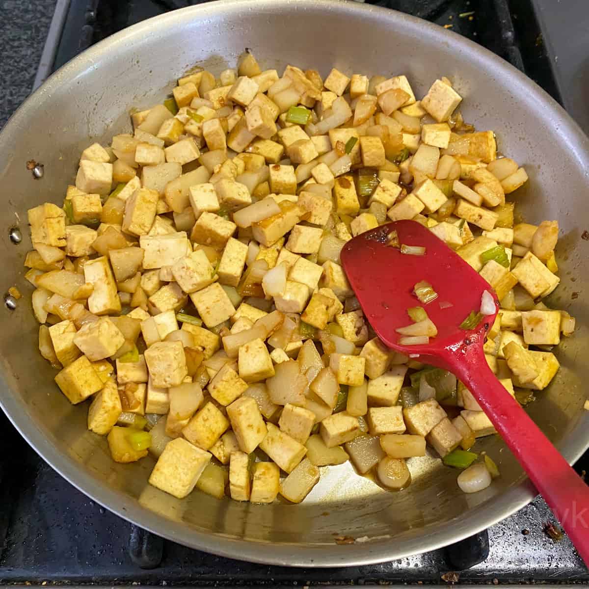 - Next, add chopped tofu and cook until all the moisture is absorbed and the tofu browns slightly.