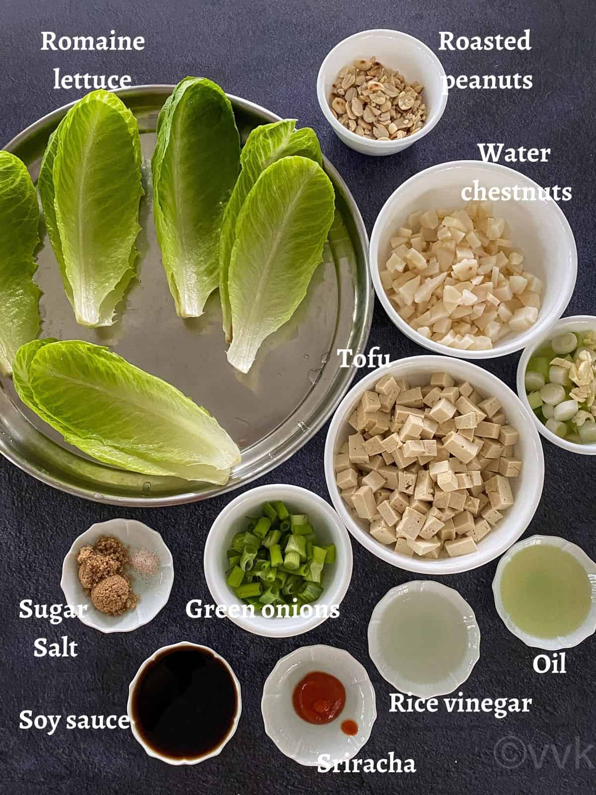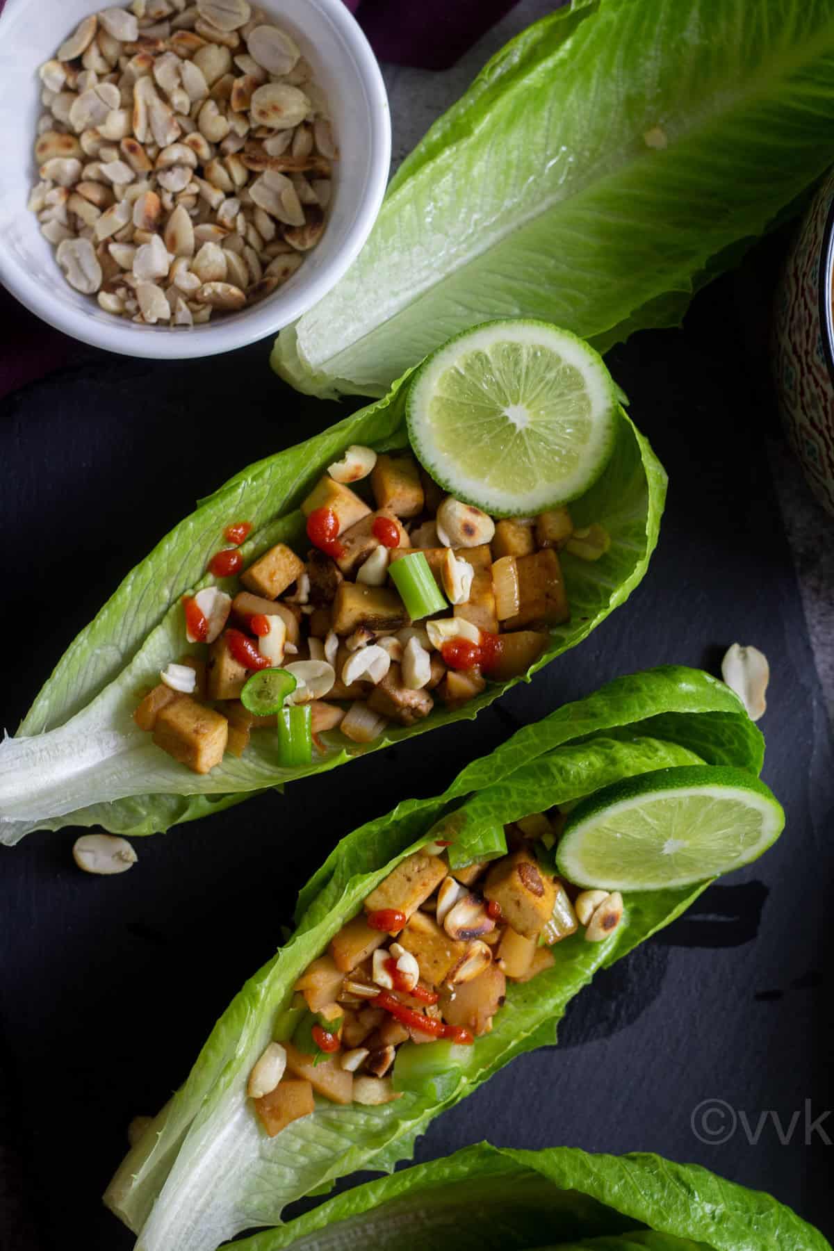- I made lettuce cups by layering two leaves together. You can use one leaf too. Fill each lettuce cup with 3 to 4 tbsps of the tofu mixture. Top it up with crushed peanuts, some more green onions, some lime juice, and serve immediately. If you like a spicy filling, drizzle some more sriracha sauce on top. This measure should fill about 6 to 8 lettuce cups.