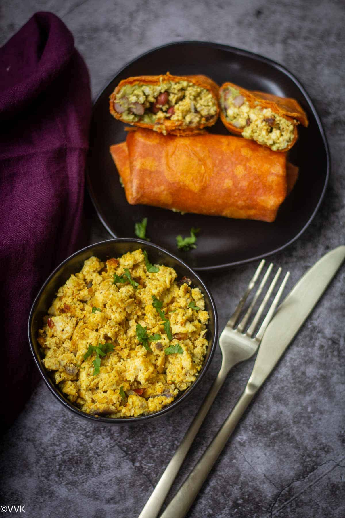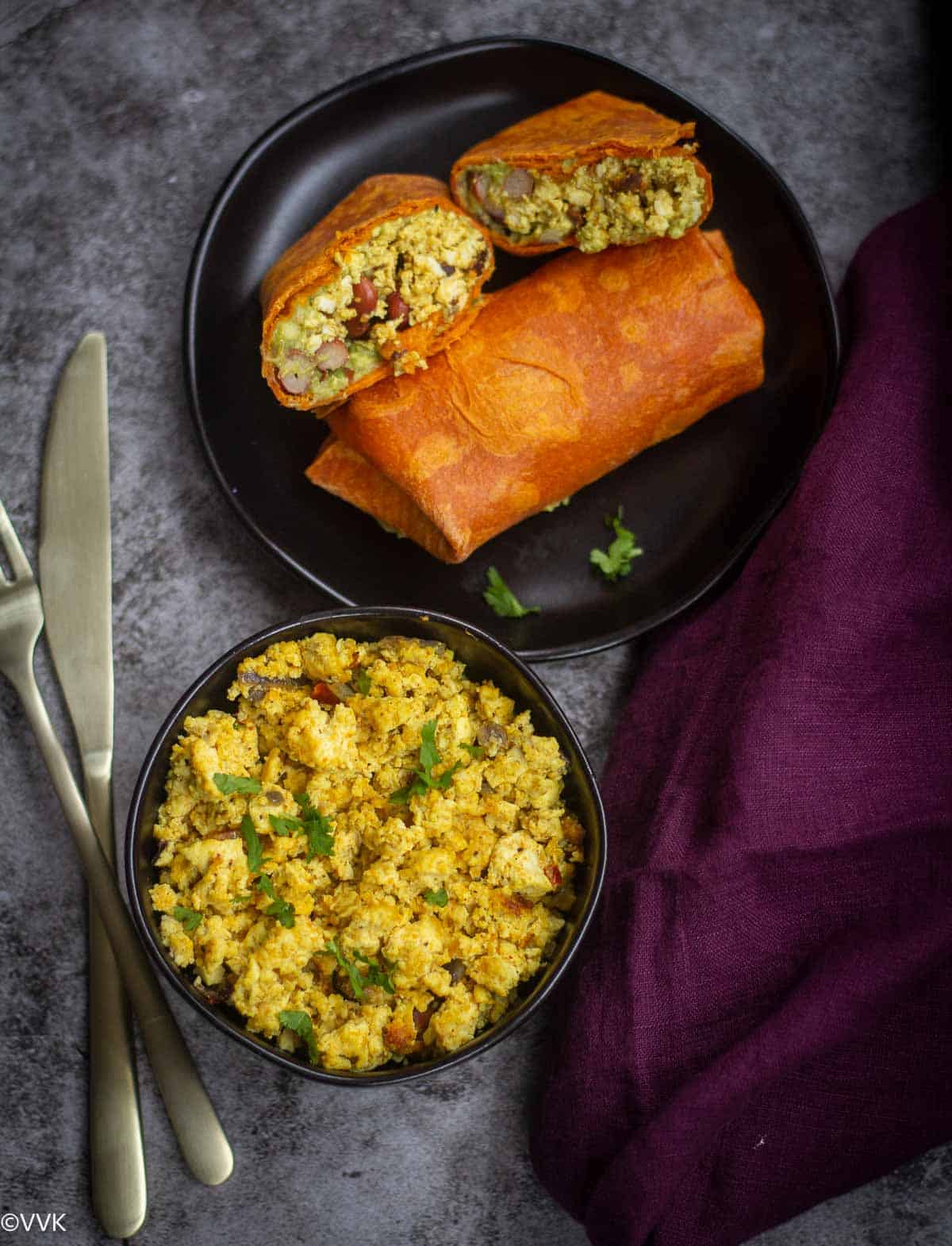 - Warm the tortilla, spread some guacamole, and add 3 to 4 tbsps of scrambled tofu and beans. Roll it into a burrito and enjoy.