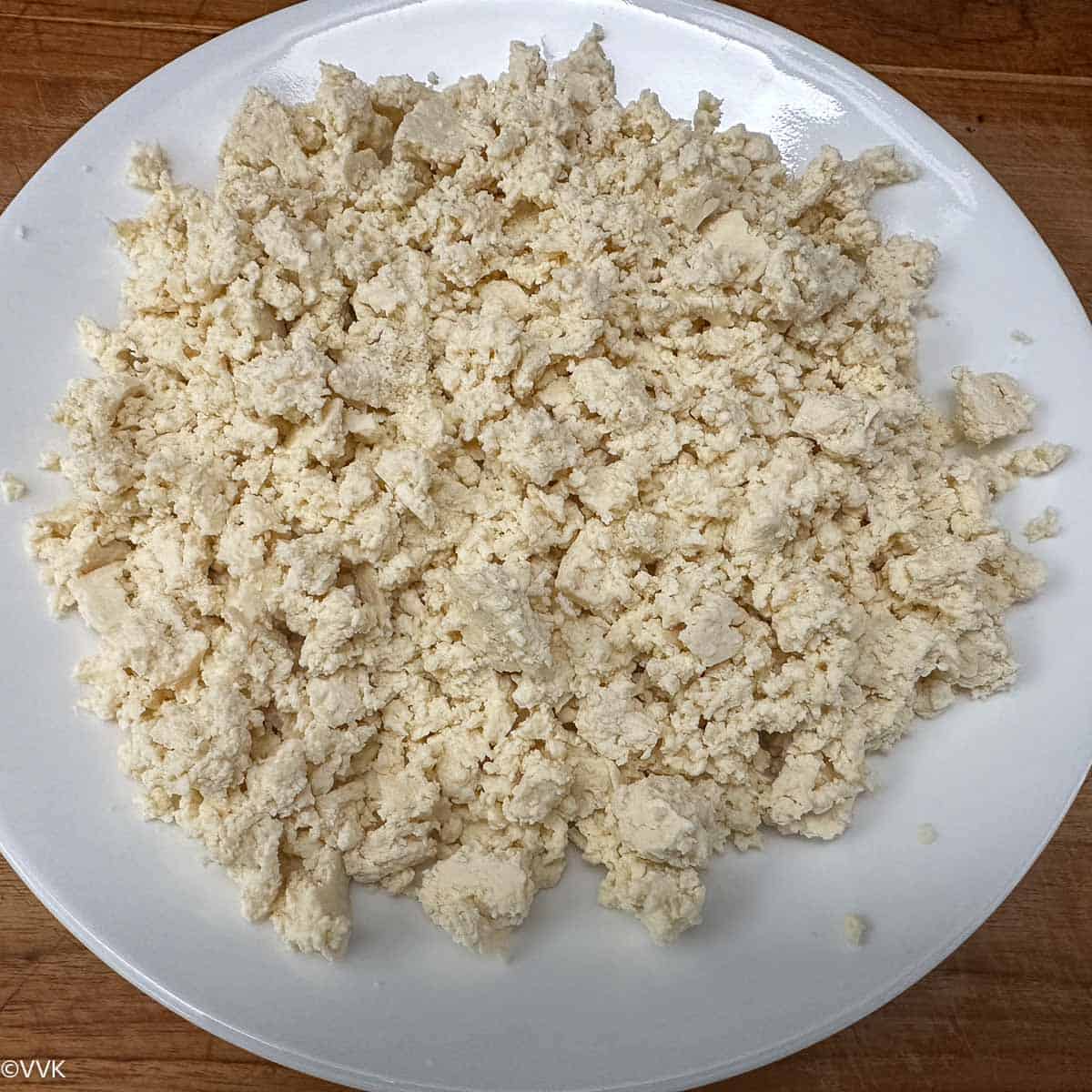 - Crumble the tofu like below and no need to press the tofu for this recipe.