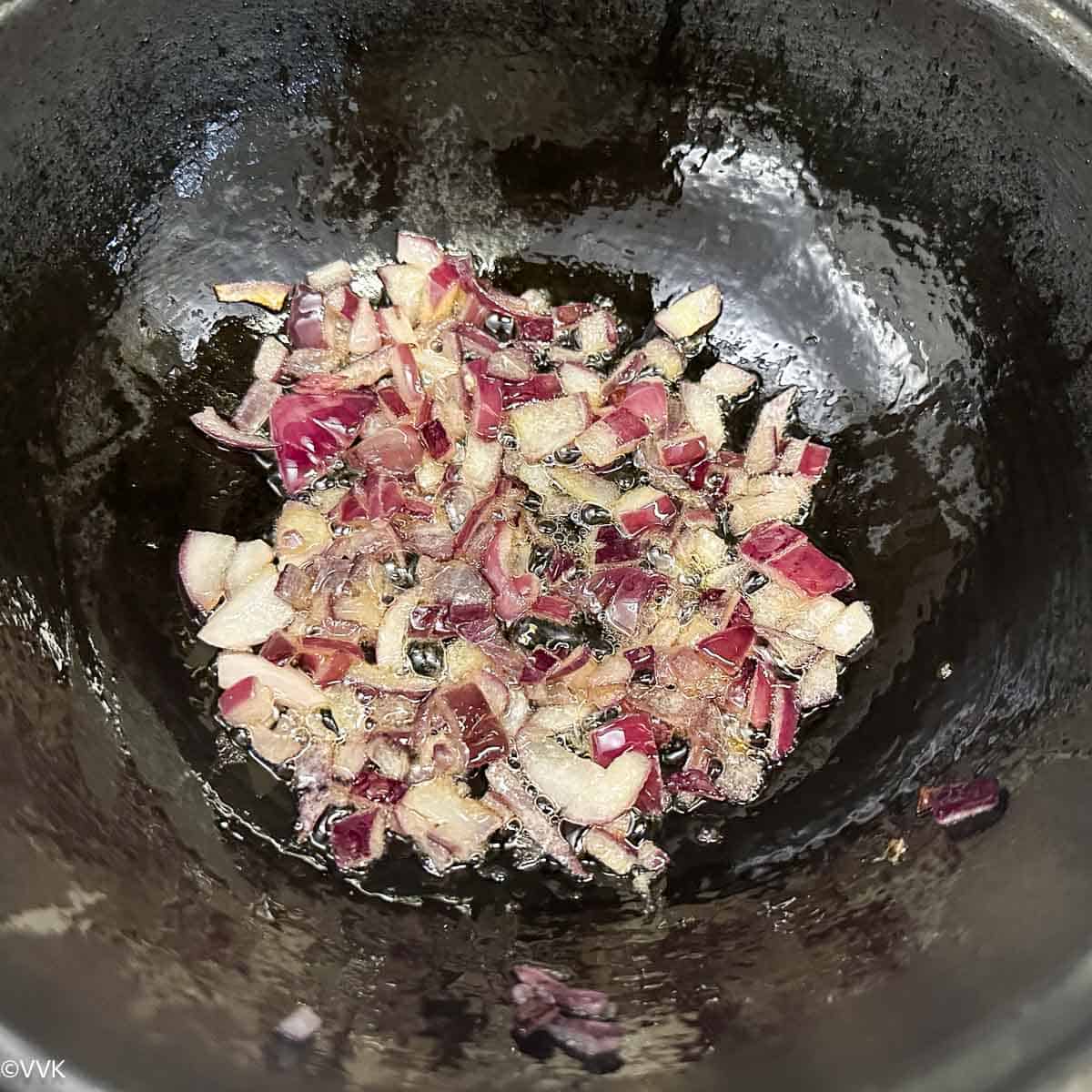- Add oil to a pan or skillet; add the chopped onions when hot. Saute the onions until it turns soft and translucent.