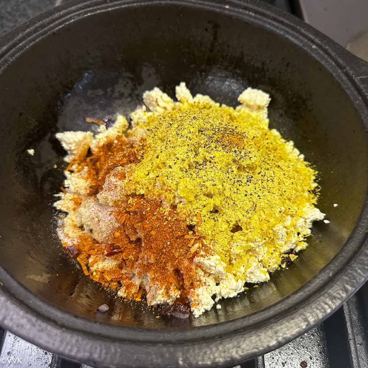 - Now add the crumbled tofu and all the spices – onion powder, turmeric powder, salt, taco seasoning, black pepper powder, and nutritional yeast.