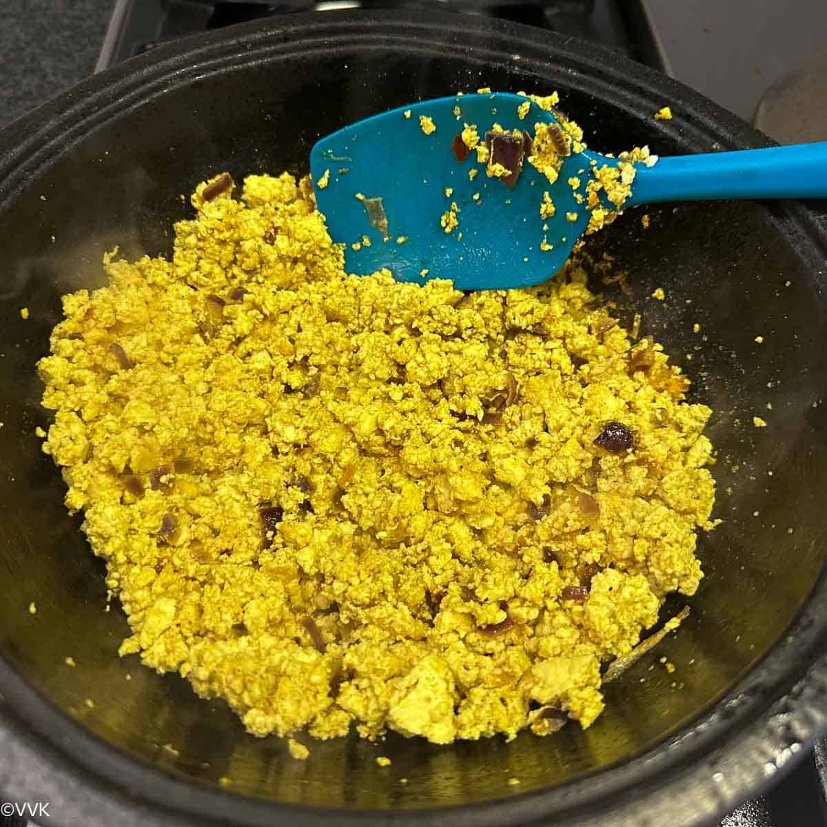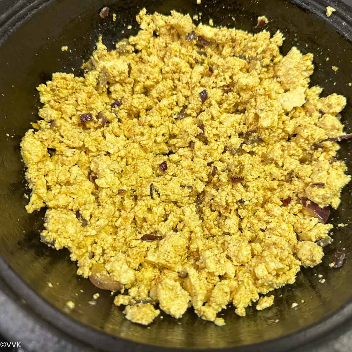 - As you cook, you will notice crust forming. Stir the tofu in between, and do not leave it unattended. Here is the tofu scramble after cooking.