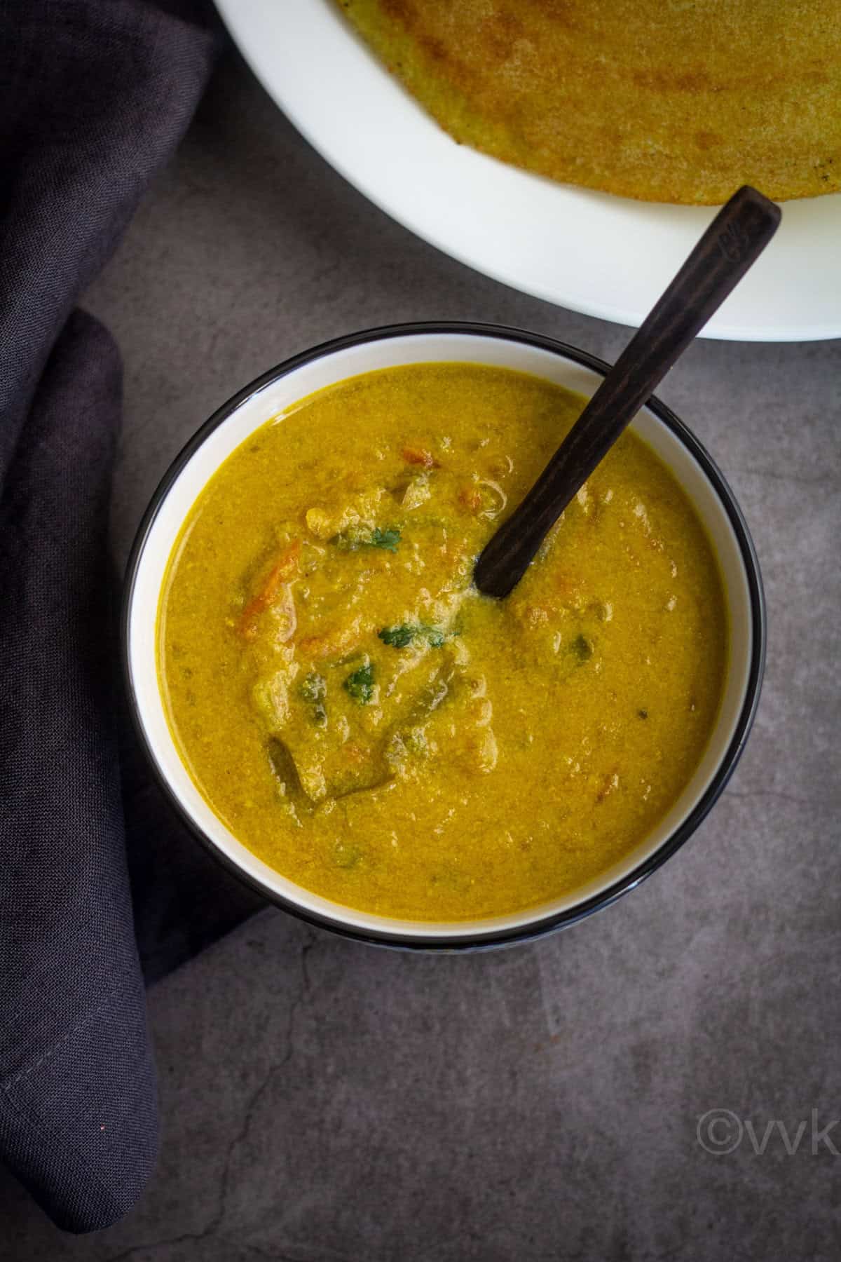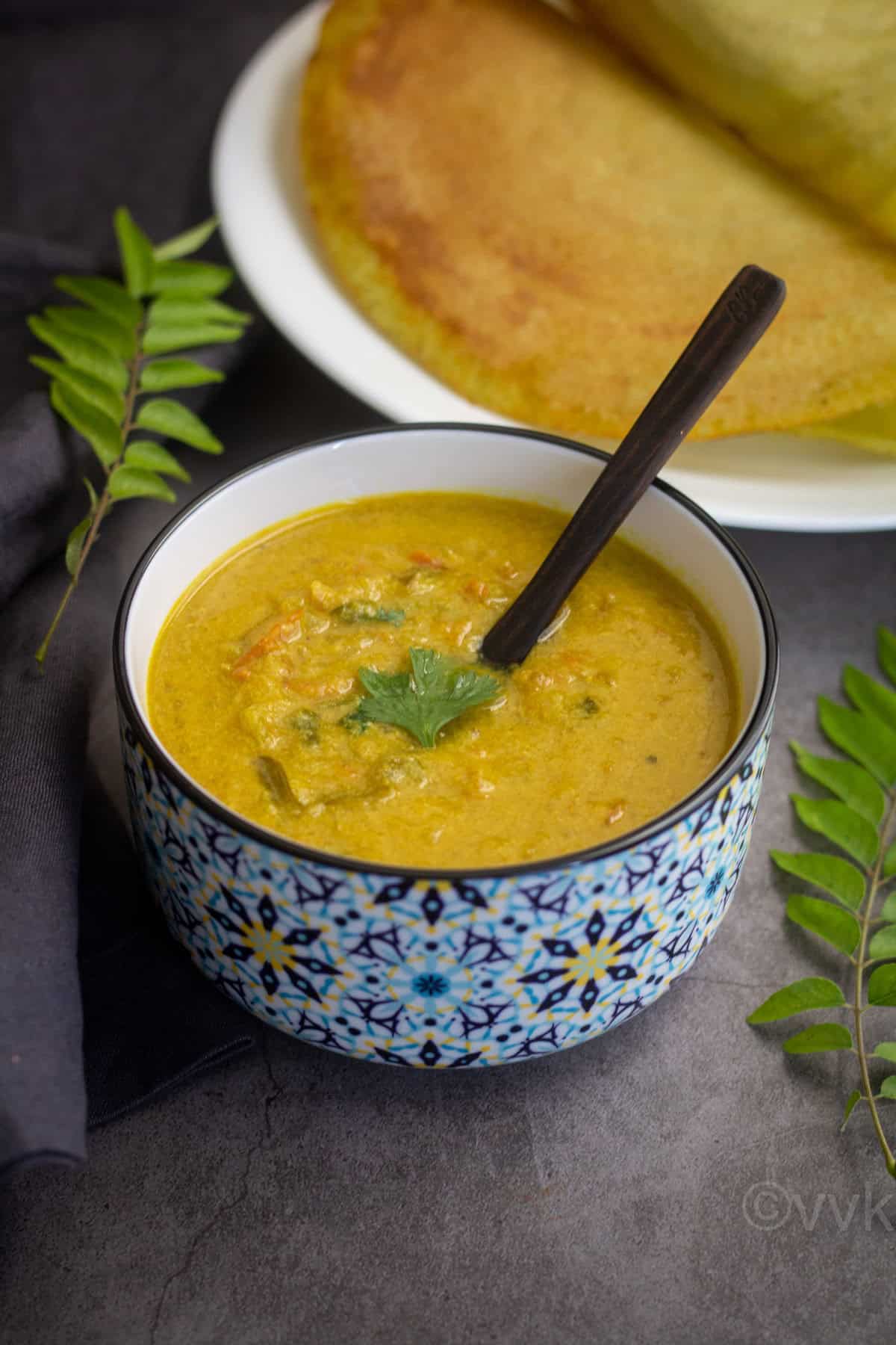 This tomato kurma recipe is naturally vegan and gluten-free. For a nut-free version, skip the cashews and add a few more roasted gram or hemp seeds too.You can serve this kurma with idli, dosa, idiyappam, sevai, roti, or parotta. I served this with dill dosa.