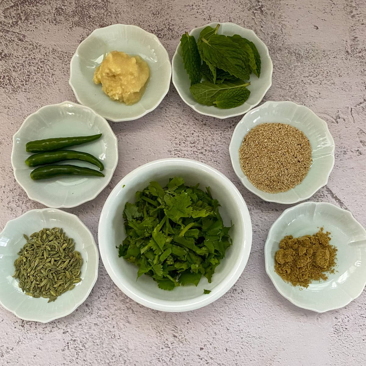 For the green masala – We need cilantro, mint leaves, green chilies, poppy seeds, fennel seeds, ginger-garlic paste, and ground coriander for the green masala.