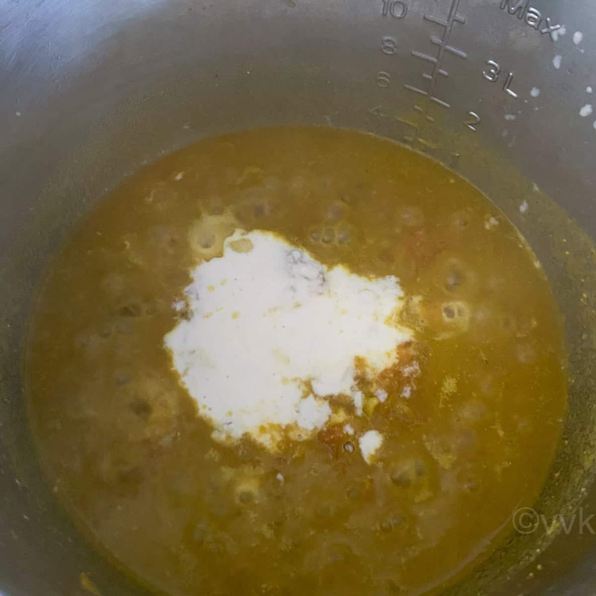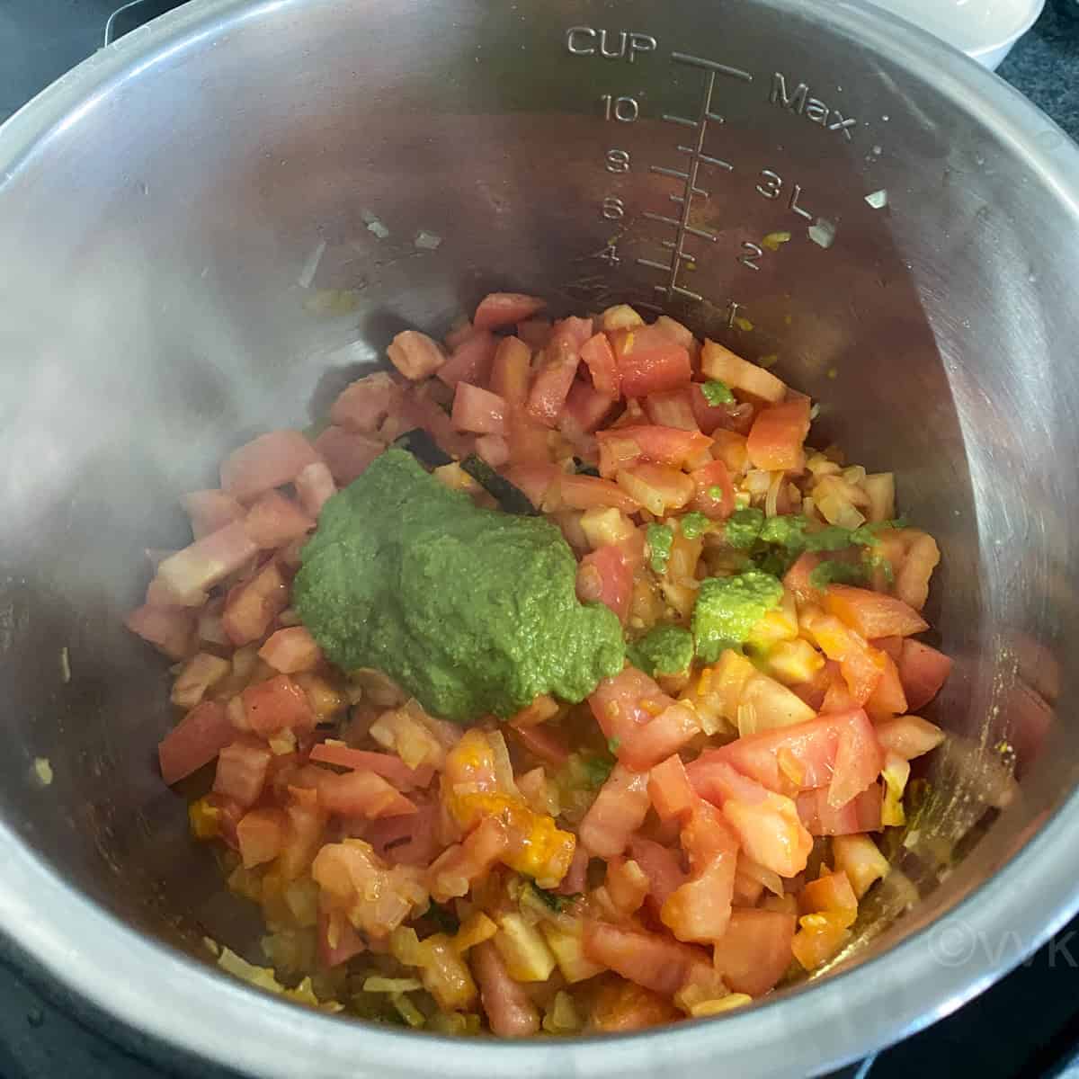 - Open the Instant Pot, set it in saute mode, and mix and mash the tomatoes. Simmer for 5 minutes, and then add the ground coconut masala. Mix well and simmer again for 5 minutes. Finally, add two more tbsp of cilantro and turn off the Instant Pot.