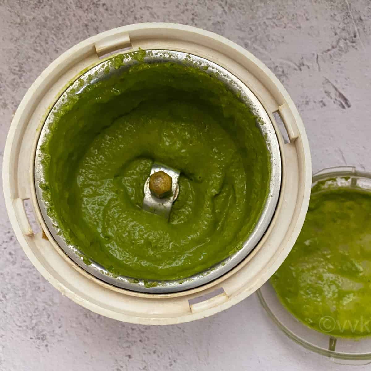 - Grind all the ingredients given under green masala by adding ¼ cup of water and set it aside.