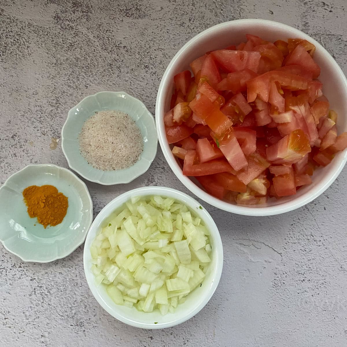 Other ingredients – The other main ingredients are onions, tomatoes, salt, and ground turmeric. Use nice juicy and ripe tomatoes. I have tried this recipe with Roma tomatoes and heirloom tomatoes. I prefer these two varieties. We need water too to grind the masala and also for the gravy.