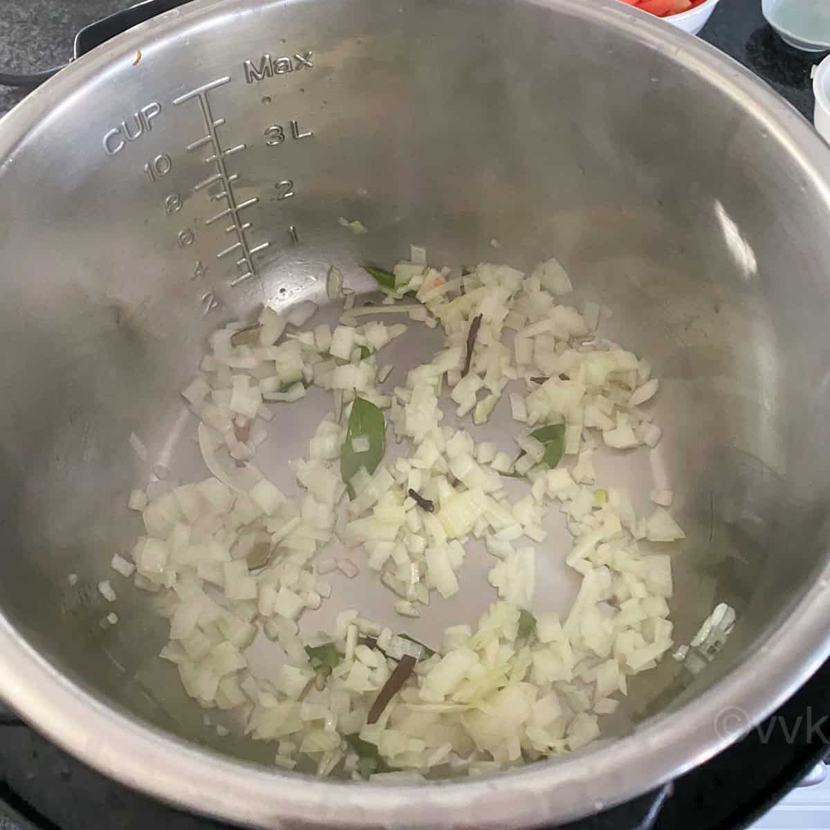 - Set the Instant Pot in saute mode, and when it is hot, add the oil. Wait for 30 seconds, and add the cinnamon, cloves, cardamom, and curry leaves. Fry for 30 to 45 seconds, and then add the chopped onion and saute for five minutes.