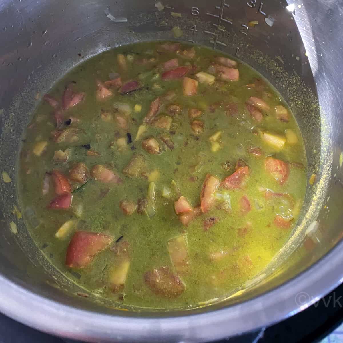 - Add the chopped tomatoes, green masala, turmeric powder, and salt. Mix well and add 2 cups of water. Turn off the Instant Pot and close it. Ensure the sealing ring is in place and set the vent to the sealing position. Pressure cook for two minutes, and after the cooking is done, naturally release the pressure.