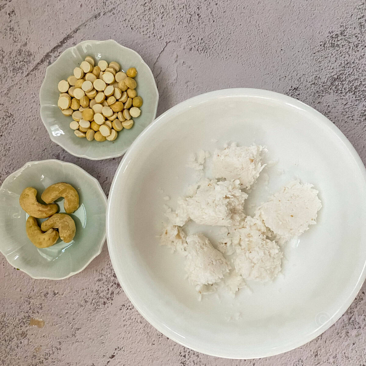 For the coconut masala – We need grated coconut, roasted gram (pottukadalai), and cashew nuts.