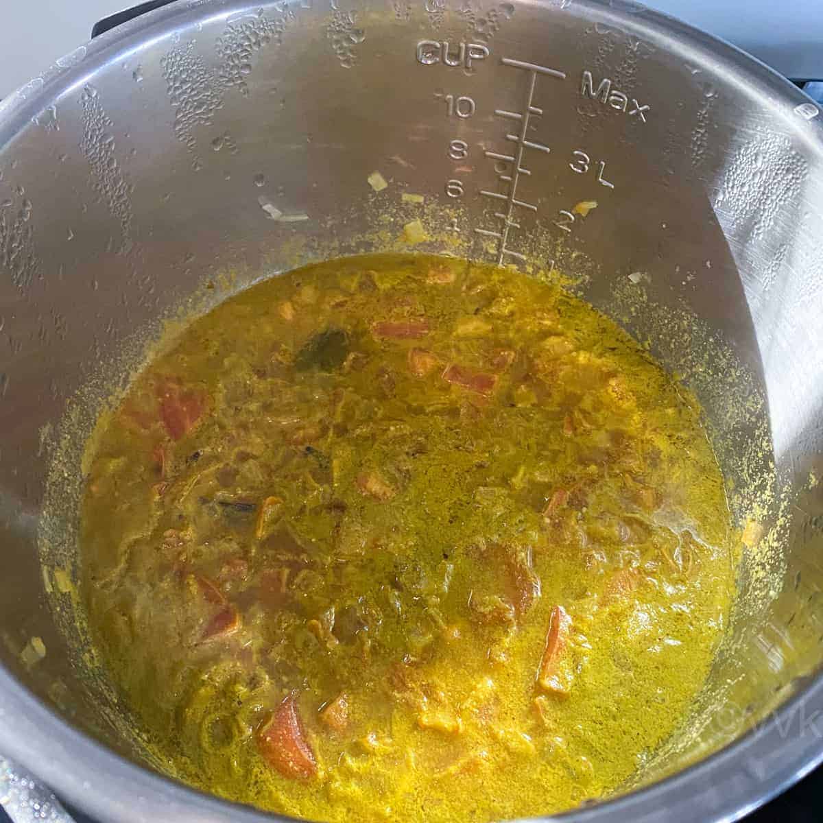 - Open the Instant Pot, set it in saute mode, and mix and mash the tomatoes. Simmer for 5 minutes, and then add the ground coconut masala.
