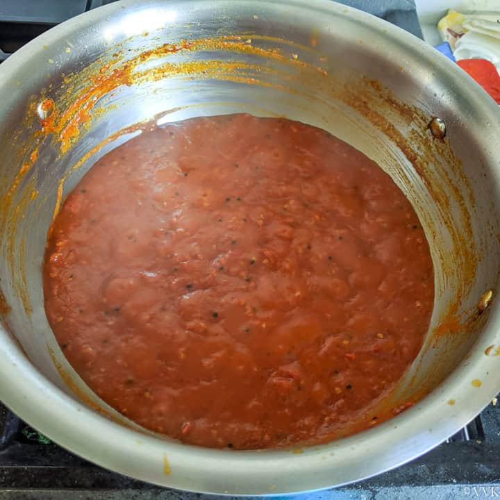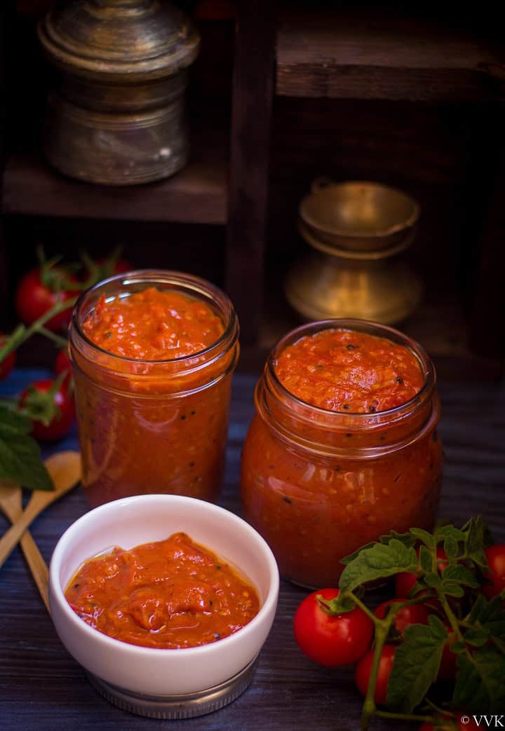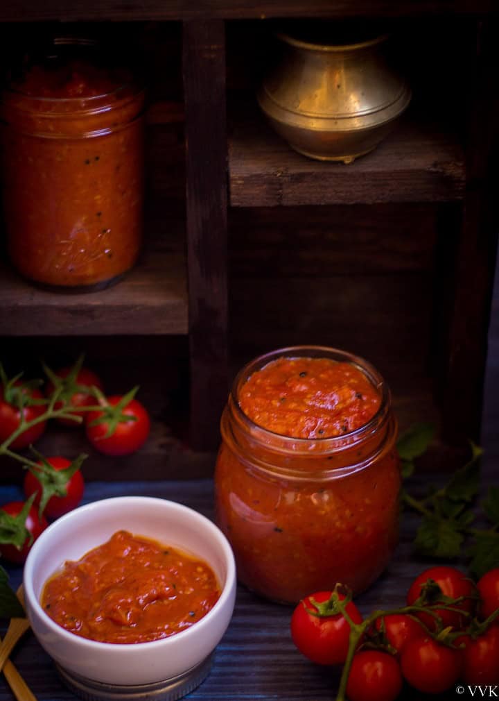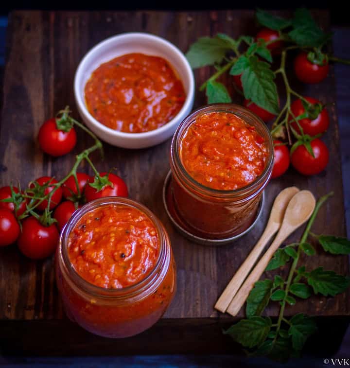 Making the thokku is very simple. We chop the tomatoes and cook it along with spices until all the moisture is absorbed. That’s the critical thing for the longer shelf life. You need to simmer it over medium-low heat for 30 to 35 minutes. I know that’s a lot of time. But that slow cooking helps the flavors to blend in nicely and trust me, folks, the thokku will taste amazingly good.