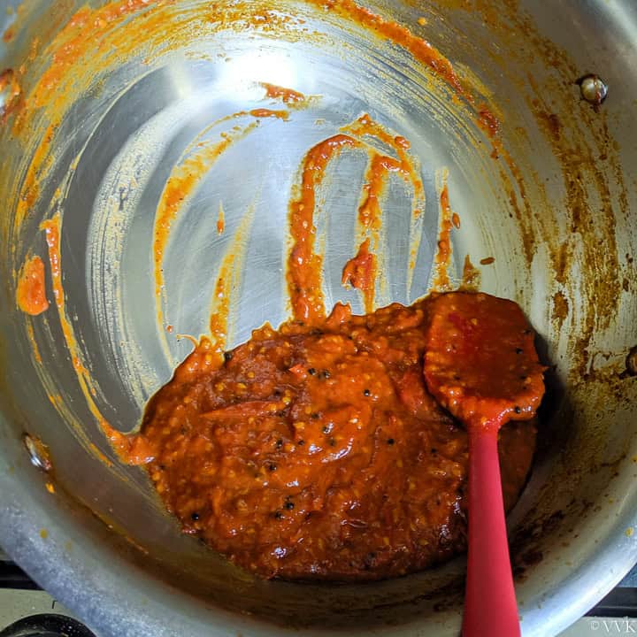 - Cook until all the moisture is absorbed and oil oozes out on the top. It usually takes about 30 to 35 minutes. Keep mixing the thokku for every five minutes so that it doesn’t stick to the pan’s bottom.