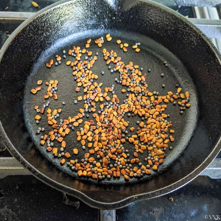 - If you have store-bought mustard seed powder and fenugreek powder, you can use ¼ tsp of mustard seed powder and ¾ to 1 tsp of fenugreek powder. You can skip the roasting and grinding the mustard seeds and fenugreek seeds.
