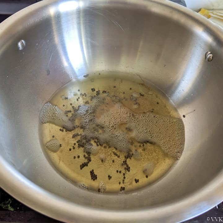 - When the oil is hot, add the mustard seeds and hing. Allow the mustard seeds to splutter. Gingelly oil will become frothy as well.