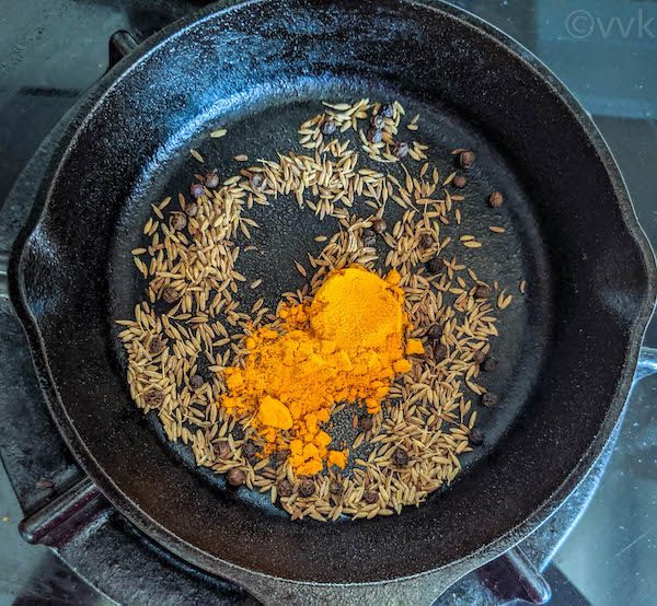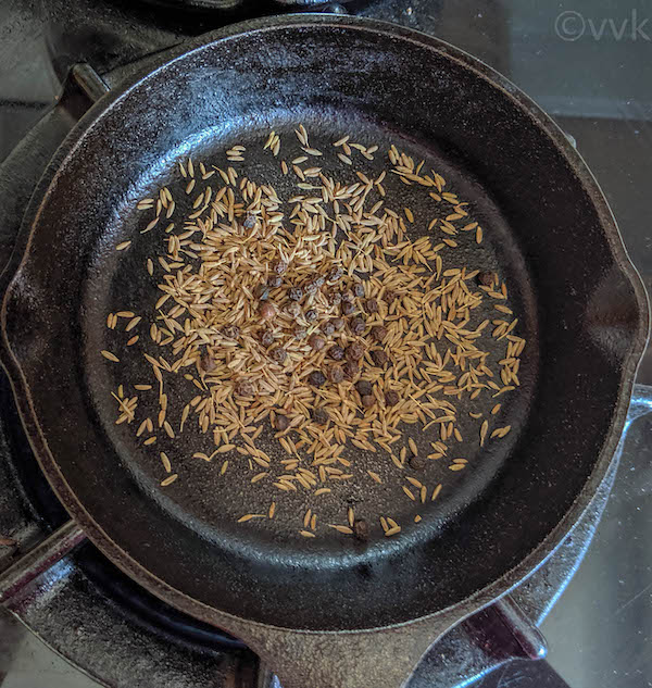 - Heat a pan over medium heat and when the pan is hot add the cumin seeds and whole pepper and dry roast it for about a minute or until the aroma of cumin seeds come out.