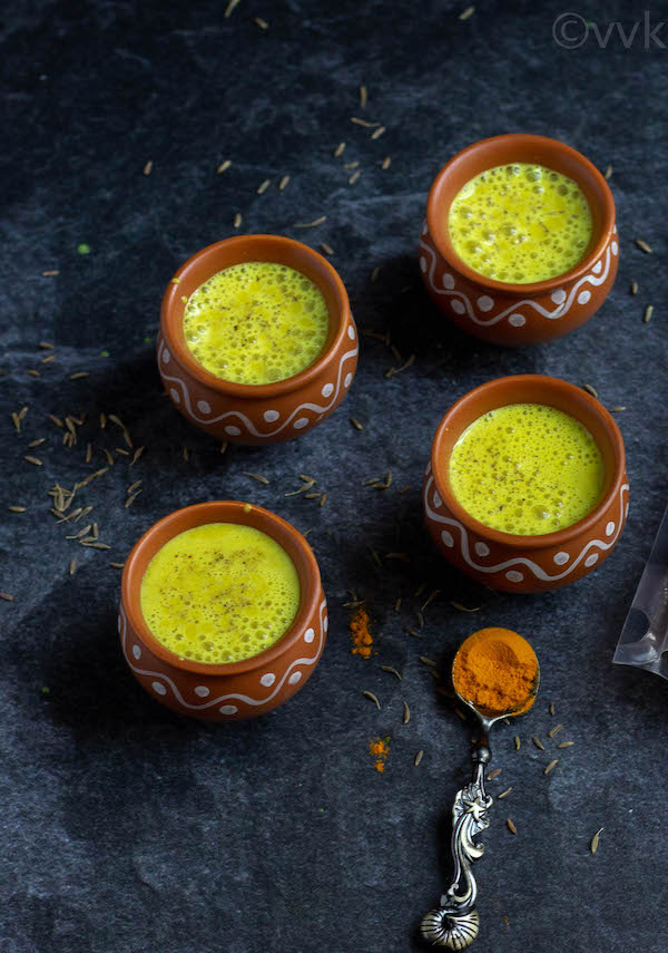 Try this cool and refreshing turmeric buttermilk with flavors of cumin, mint, and whole pepper after a hearty meal. Your tummy will thank you for sure!