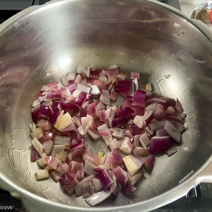 - Heat the pressure cooker or pressure pan and add the oil. When the oil is hot, add the onions and saute them for a couple of minutes or until the onion is soft.