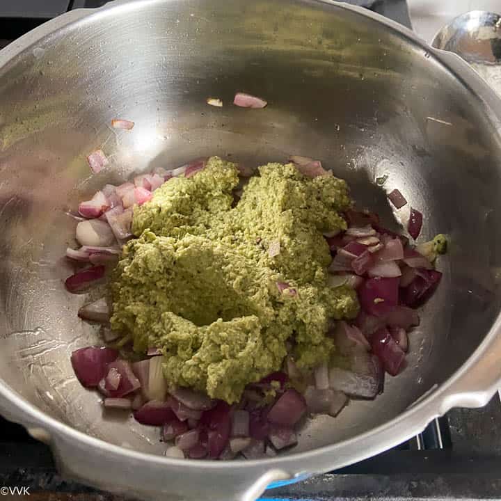 - Add ½ cup water and cook till the raw smell goes off. Make sure to your stir regularly, and if needed, sprinkle some water. The ground paste tends to stick to the pan if unattended. Next, add the salt and cook for a minute.