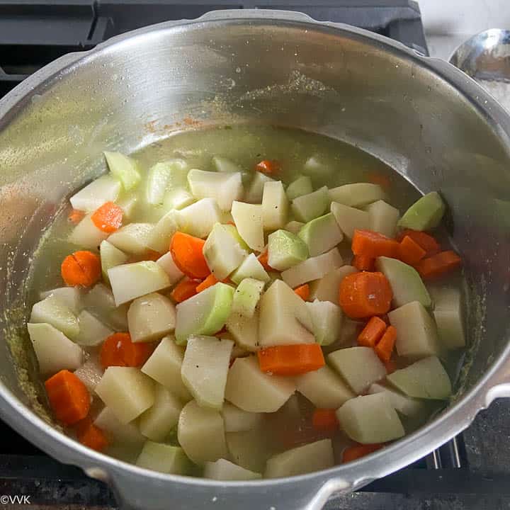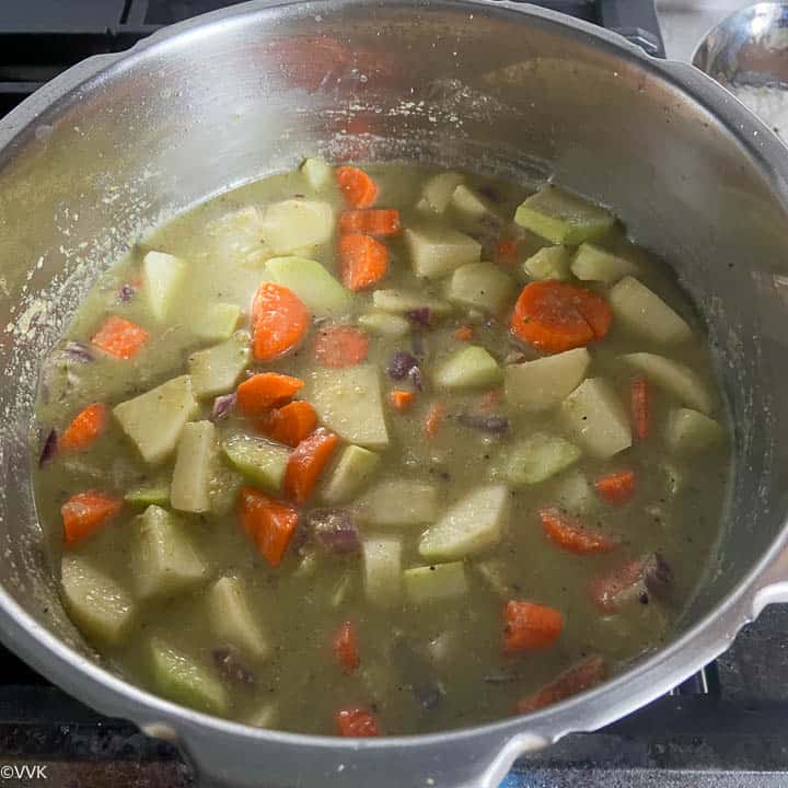 - Instant Pot Version: If using IP, saute the onion and the ground paste in saute mode and add the veggies and water. Then pressure cook at high-pressure manual mode for 4 to 5 minutes and let the pressure release naturally.