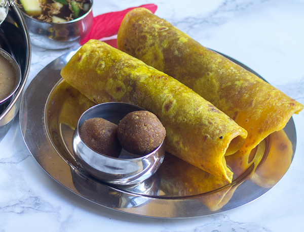 - Obbattu – A sweet flatbread with channa dal – jaggery stuffing. Recipe in my Essential South Indian Cookbook. I will post a different version here soon. Those small laddoos are the leftover stuffing.