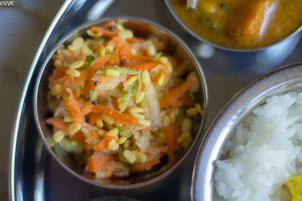 One thing we don’t skip on Yugadi is the Bevu Bella Pachadi; I have explained its significance in this post. In the US, we don’t get off for Ugadi. If the festival falls on weekdays, I typically ensure the Ugadi spread has bevu bella, panagam, neer mor, kheer/payasam, and kosambari. Then I either make sambar rice or bisibelebath and raita so that we can pack the same for lunch. If it falls during the weekend, I make elaborate meals with sambar, rasam, palys/poriyal, vadai, and obbattu like below.