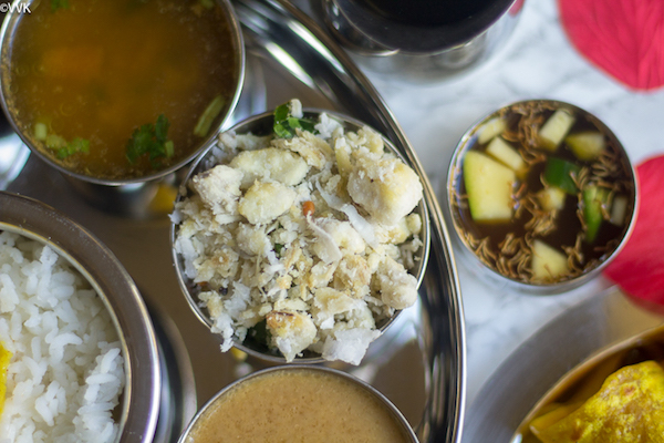 - Obbattu – A sweet flatbread with channa dal – jaggery stuffing. Recipe in my Essential South Indian Cookbook. I will post a different version here soon. Those small laddoos are the leftover stuffing.