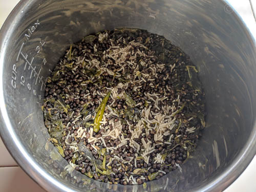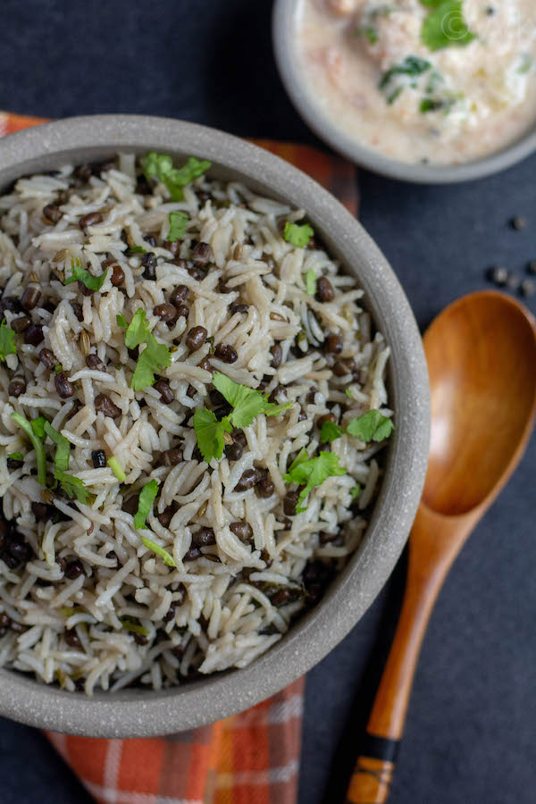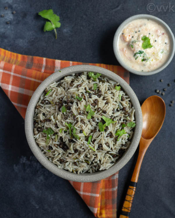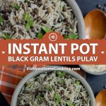 For this recipe, I soaked the whole black gram for about 8 hours and made the pulav in rice mode. Also, I used basmati rice, and I soaked it only for 10 minutes. But if you prefer mushy rice and dal or if you are using regular white/brown rice, increase the time accordingly.