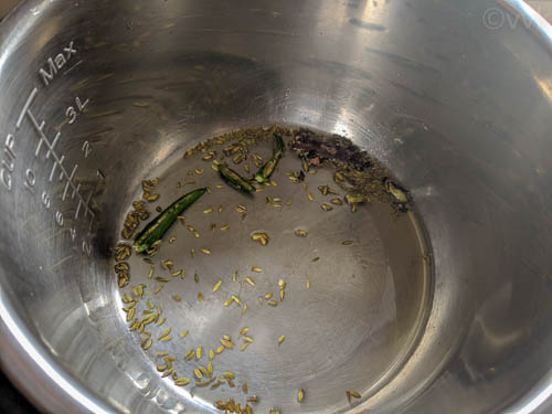 - After 30 seconds, add the fennel seeds, cardamom, cloves, cinnamon stick, black-stone flower, and the slit green chilies — Fry for 20 seconds.