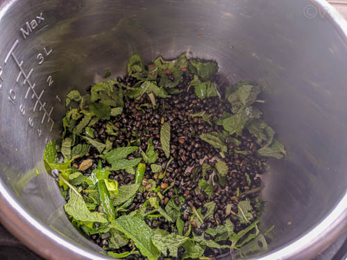 - Then add the drained black gram dal and the chopped mint and cilantro. Mix well and cook for 2 minutes.