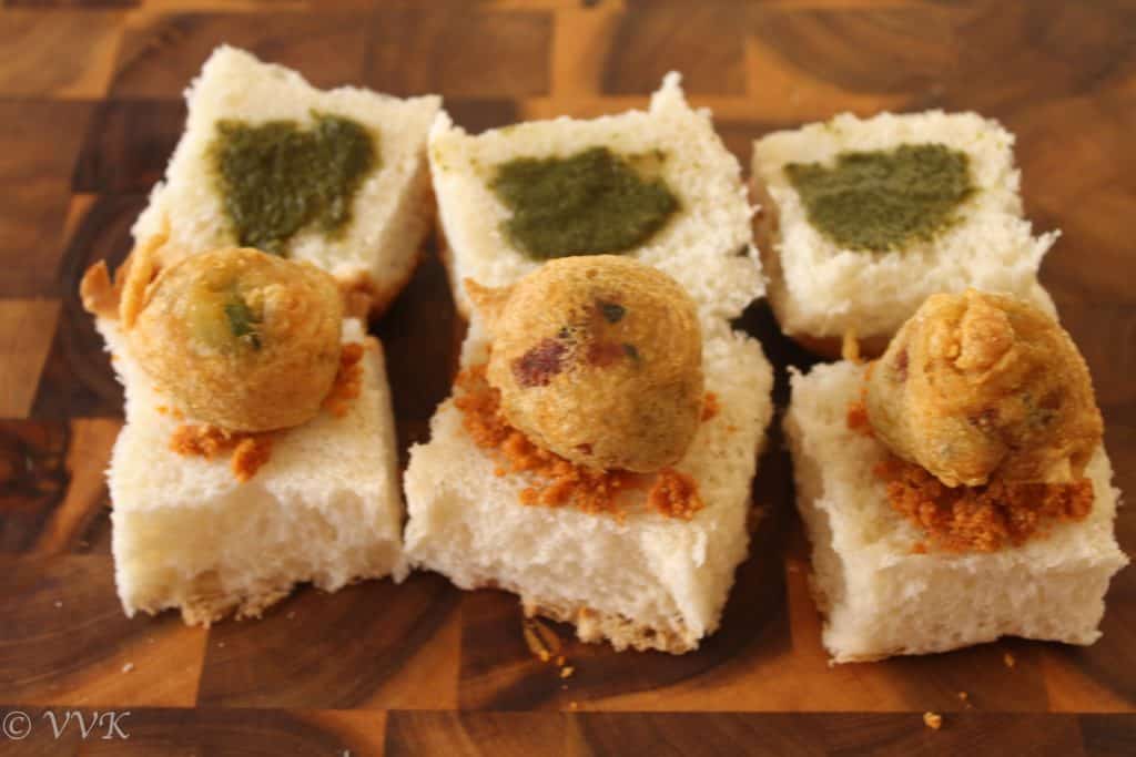 - Now spread about 1 to 2 tsps of the dry garlic chutney on one side and green chutney on the other and keep the Batata Vada on either one side and close it.
