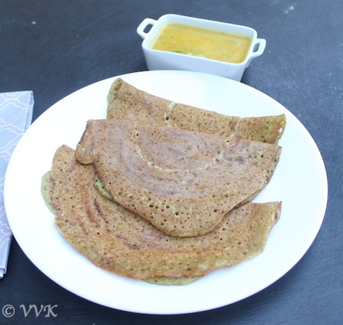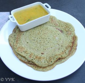 For this recipe, I didn’t cook the spinach but washed it thoroughly first with cold water and twice with hot water and pureed it along with some pepper powder. The main reason for adding black pepper to all the spinach varieties is because of its anti-bacterial property like turmeric. It kills the germs and also helps to fight against infections. The recipe is super simple. Mix the dosa batter and the puree. Add some chopped onion and temper it with cumin and some black pepper corns and prepare dosa. I served this with my super simple less than 30 minutes sambar. (Recipe coming next)