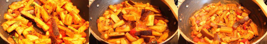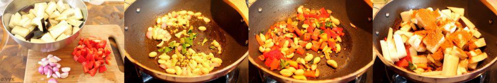 - Once the brinjals are cooked, remove the lid and continue cooking until any excess moisture evaporates.