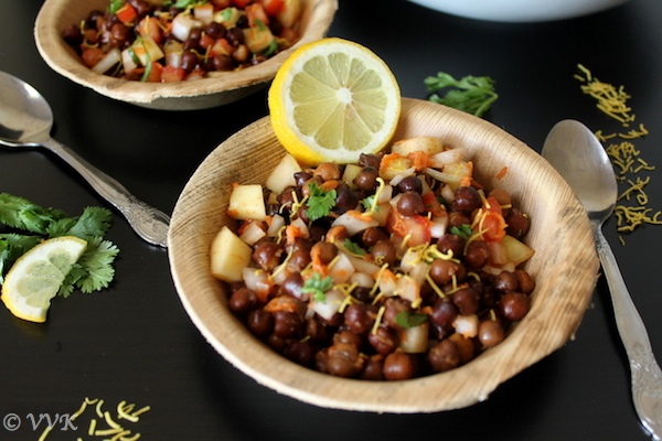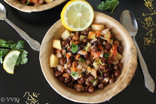 This kala chana chaat is my absolute favorite and I prepare this quite often. I usually pack this for work and relish it as a mid-morning snack or evening snack. The crunchy nature of this salad (thanks to the raw vegetables and black chickpea) makes you chew for a long time which in turn makes you feel full. This is a zero oil, vegetarian, vegan and gluten-free recipe.
