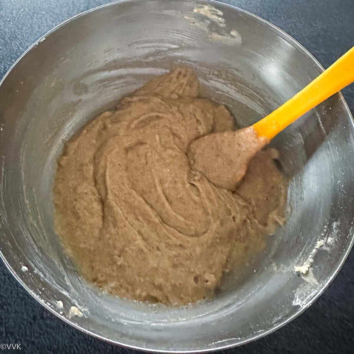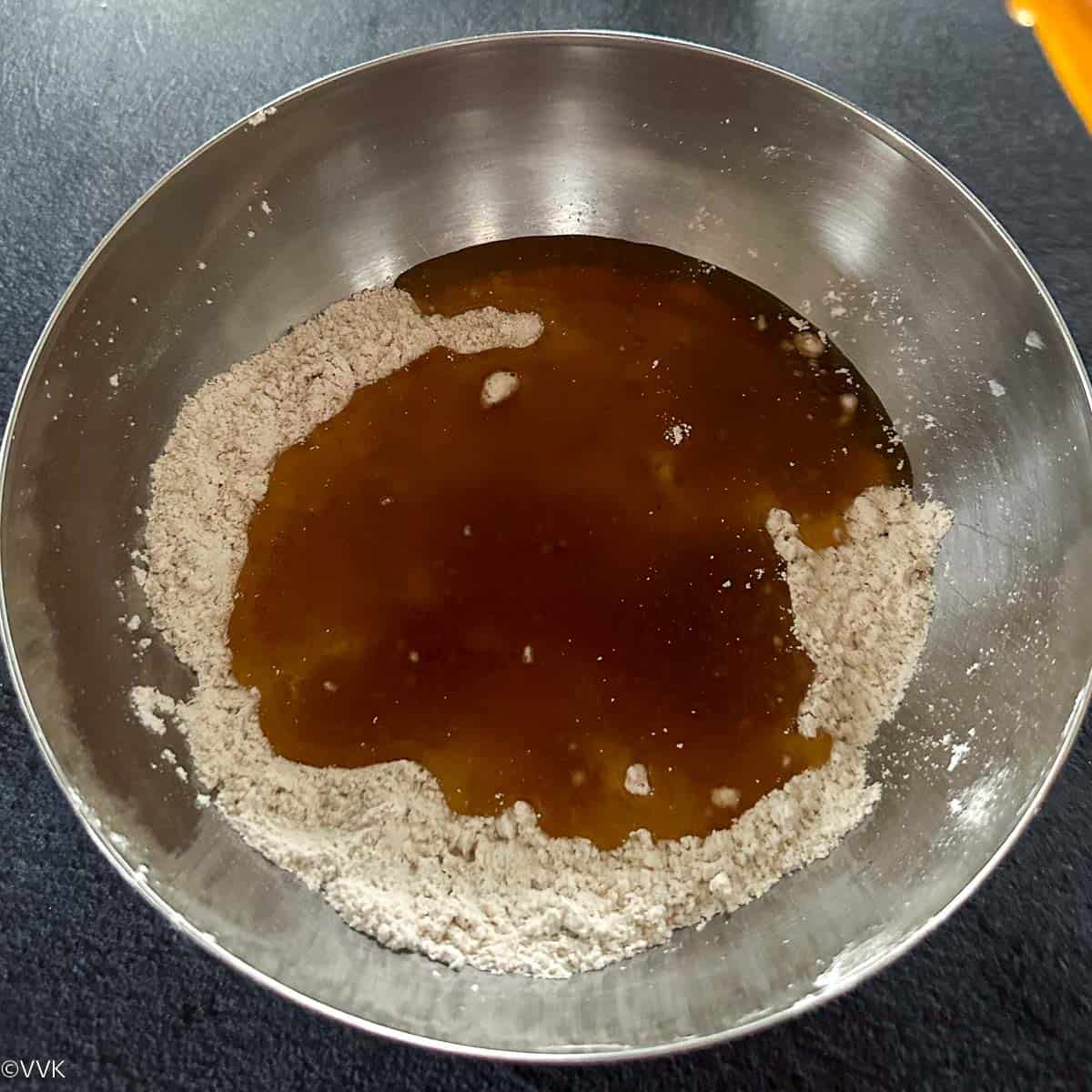 - Combine the wet ingredients in a separate bowl – apple sauce, agave nectar, and vanilla essence. Mix well without any lumps.