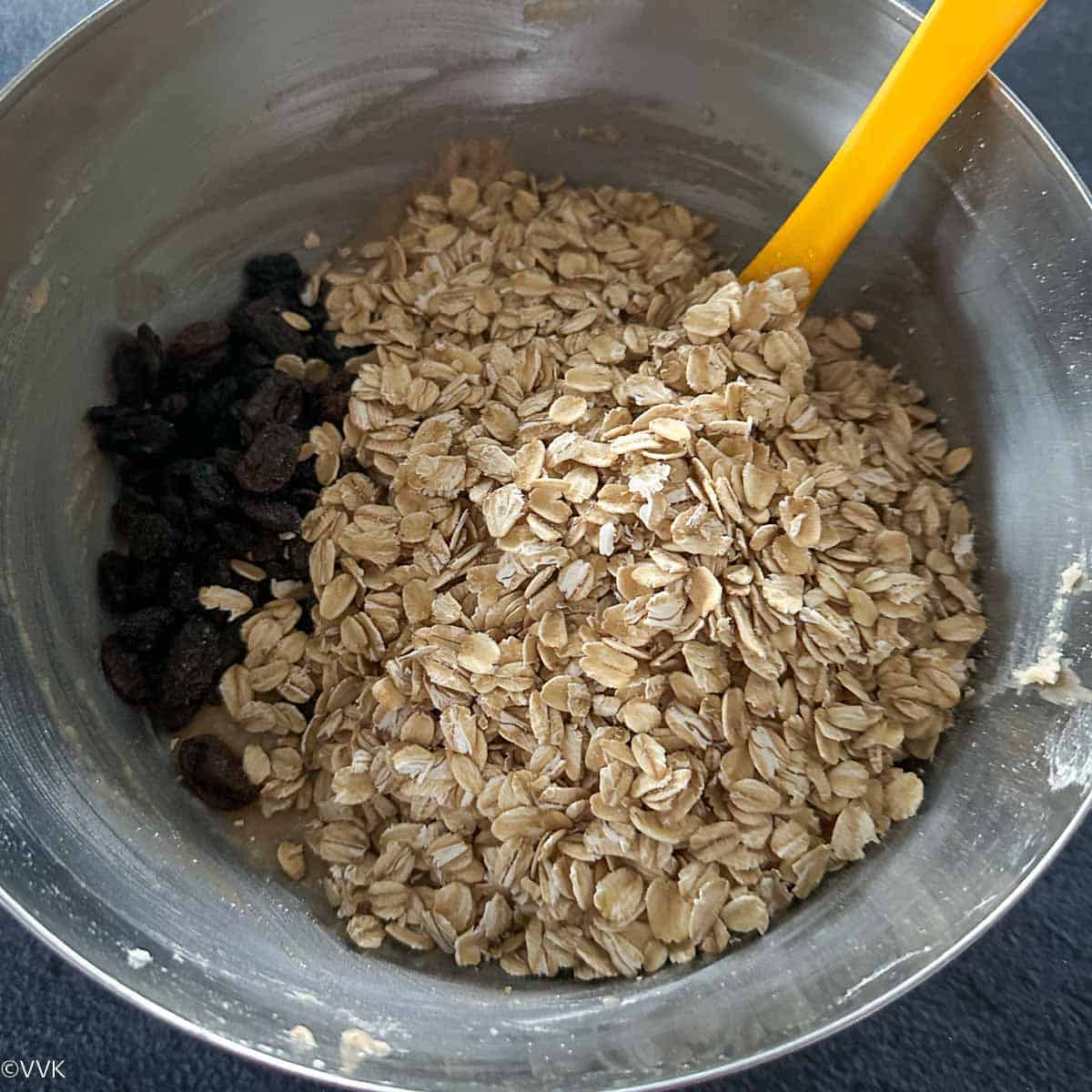 - Now add the rolled oats and raisins.