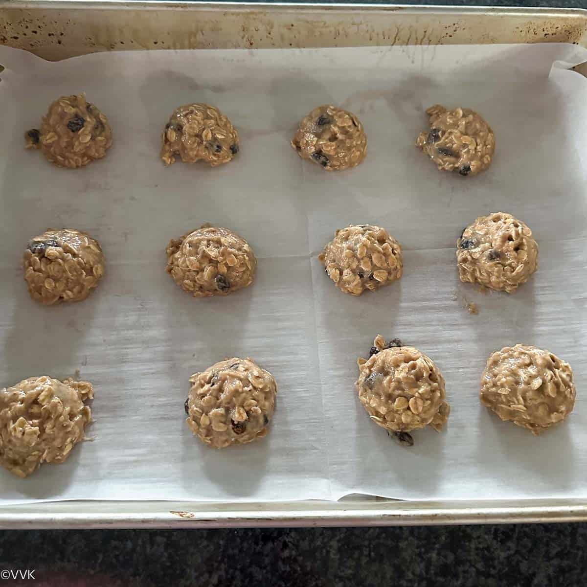 - Scoop 1 to 1.5 tbsp of the dough using a cookie scoop or ice cream scoop and place them on the baking tray. Place the cookies 1 to 1.5 inches apart.