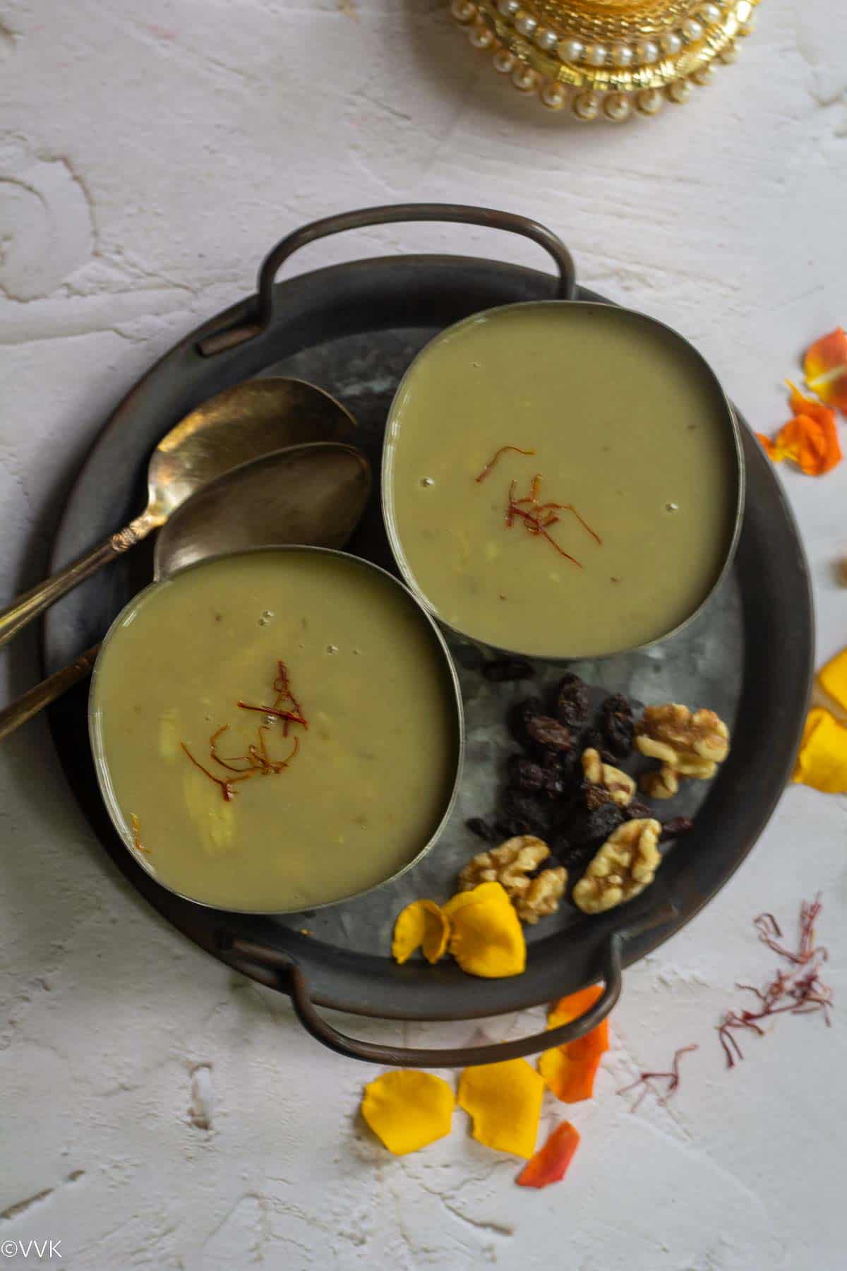 Apart from these four ingredients, we also need water and saffron strands(optional) to garnish. Please check the recipe card for exact measurements and variations and the substitution section for alternate ingredients and other options.