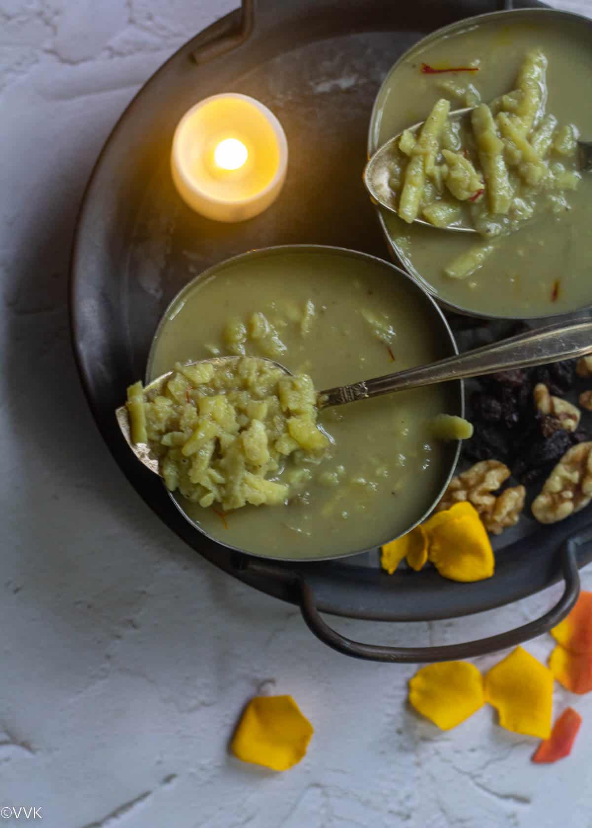 Using nuts: I kept this kheer nut-free too. You can roast nuts like cashews or walnuts in vegan or regular ghee and add it to the kheer.