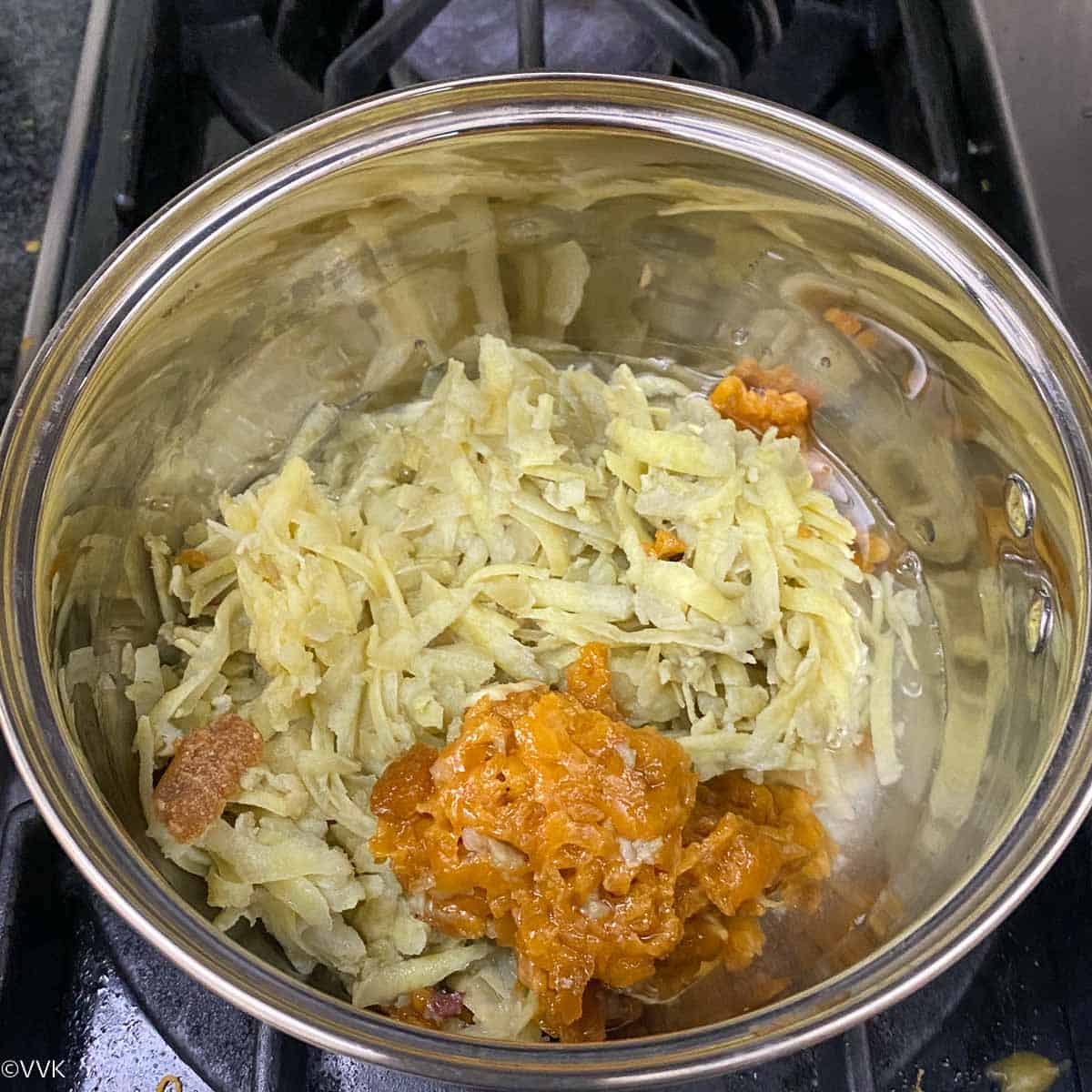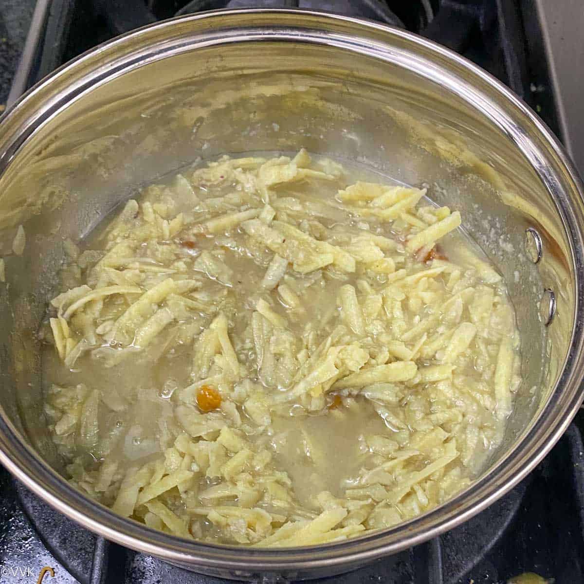 - As my jaggery had no impurities, I grated it and added it directly. Alternatively, you can first dissolve the jaggery in one cup of water and strain it. You can add the grated sweet potatoes to this strained jaggery water and continue the kheer process.